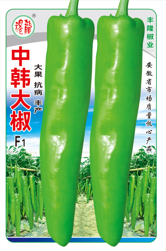 新选育的中早熟粗长牛角形杂交一代,引进韩国原种生产,早熟、黄绿色、果长20-32cm,果粗3-4cm,空腔小,肉极厚,耐储运,品质极佳,果型顺直而特光滑,单果重90g左右,最大单果可达150g以上,亩产5000-6000kg。辣味适中,抗逆性强,不易死苗,连续座果能力优秀,挂果集中,果实膨大快,耐热耐湿性强。采用远缘杂交导入抗病毒基因,极抗病毒病、炭疽病、疫病,在持续低温阴雨不利条件下可正常开花结果,适应南方露地和北方早春、秋延保护地栽培,是目前黄皮尖椒主栽区更新换代的优选品种。
